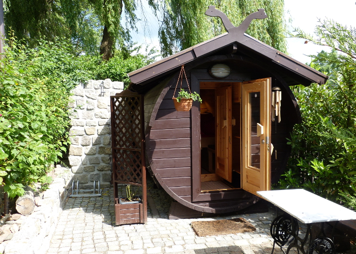 Unser Holzfaß “Lutki” ist gemütlich eingerichtet und läßt (“faßt”) keine Wünsche offen . . .